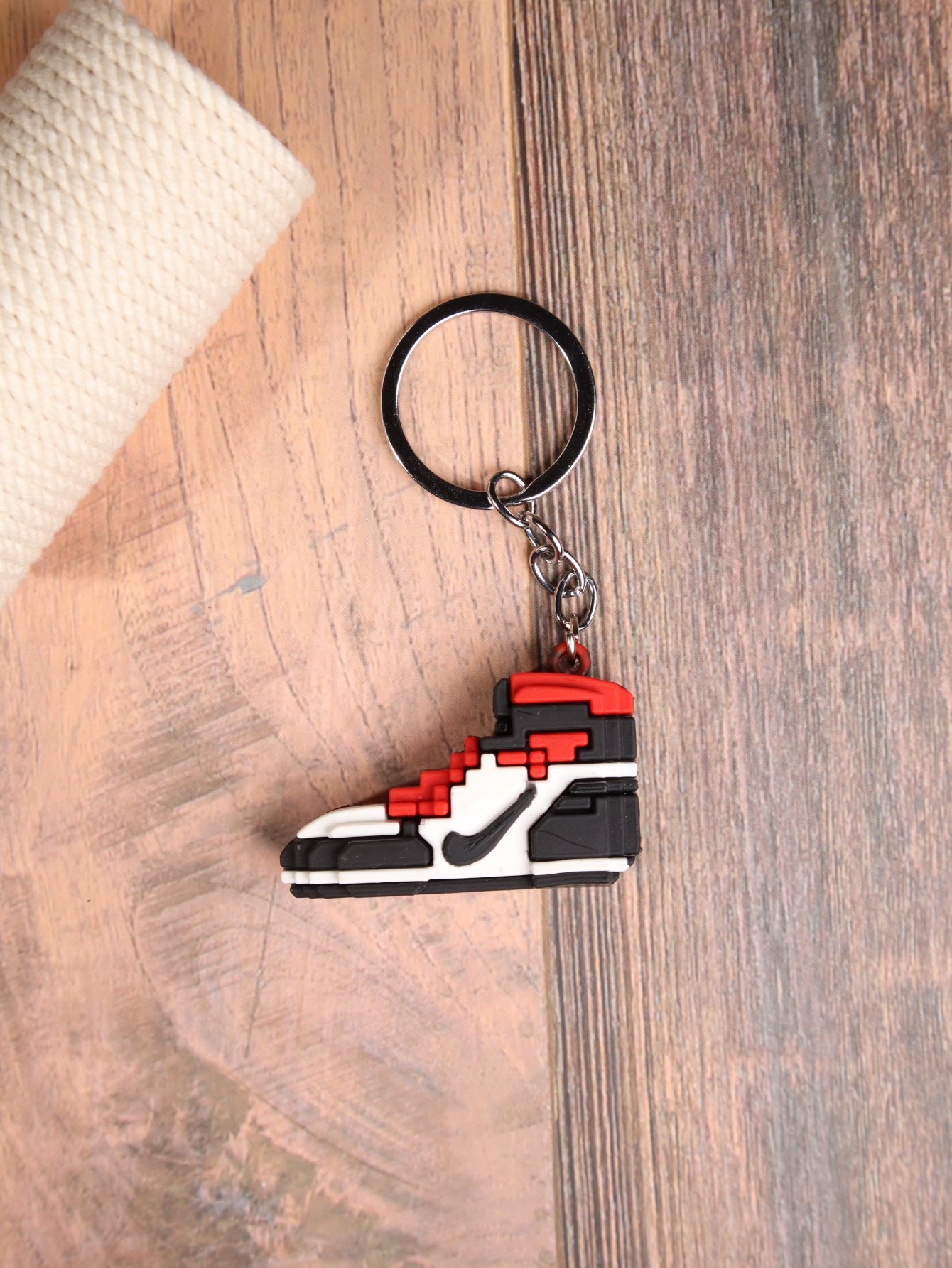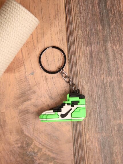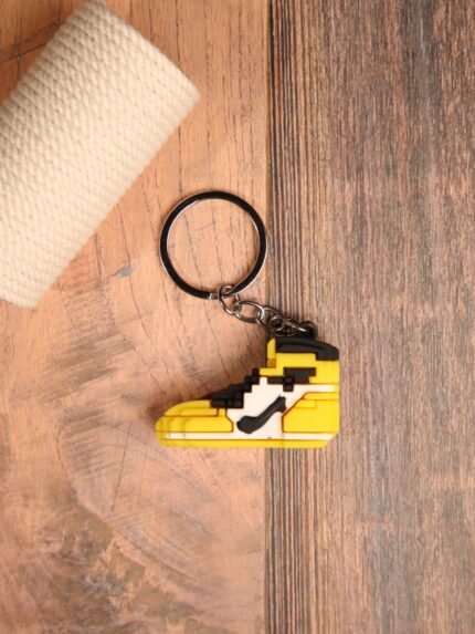Get your game on with our pixelated rubber sneaker keychain! Available in 4 bold colors: black, green, orange, and yellow available on the website. Durable, stylish, and perfect for gamers and sneakerheads.